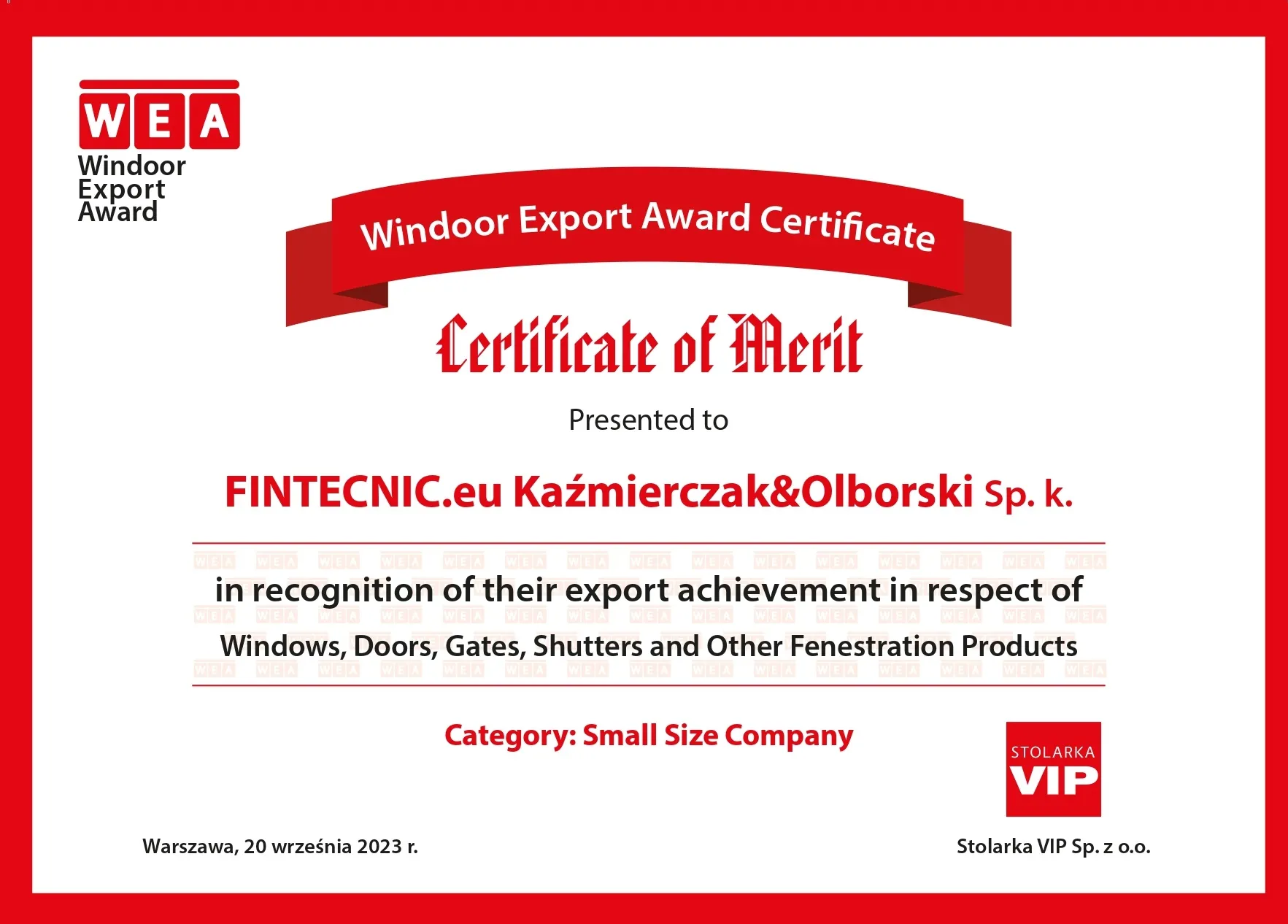 Wyróżnienie Fintecnic w konkursie „Windoor Export Award” to potwierdzenie naszej jakości i bycia liderem na rynku stolarki budowlanej. To także dowód na to, że polskie firmy potrafią konkurować na światowym rynku, oferując produkty najwyższej jakości, innowacyjne rozwiązania i doskonałą obsługę klienta.