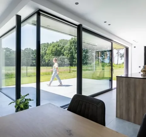 The slender profiles of MasterPatio doors allow for large glazing, ensuring maximum inflow of natural light into interiors and an unobstructed view of the surroundings. The system offers various configurations, including 2-track and 3-track variants, allowing for flexible adaptation to individual design needs.
