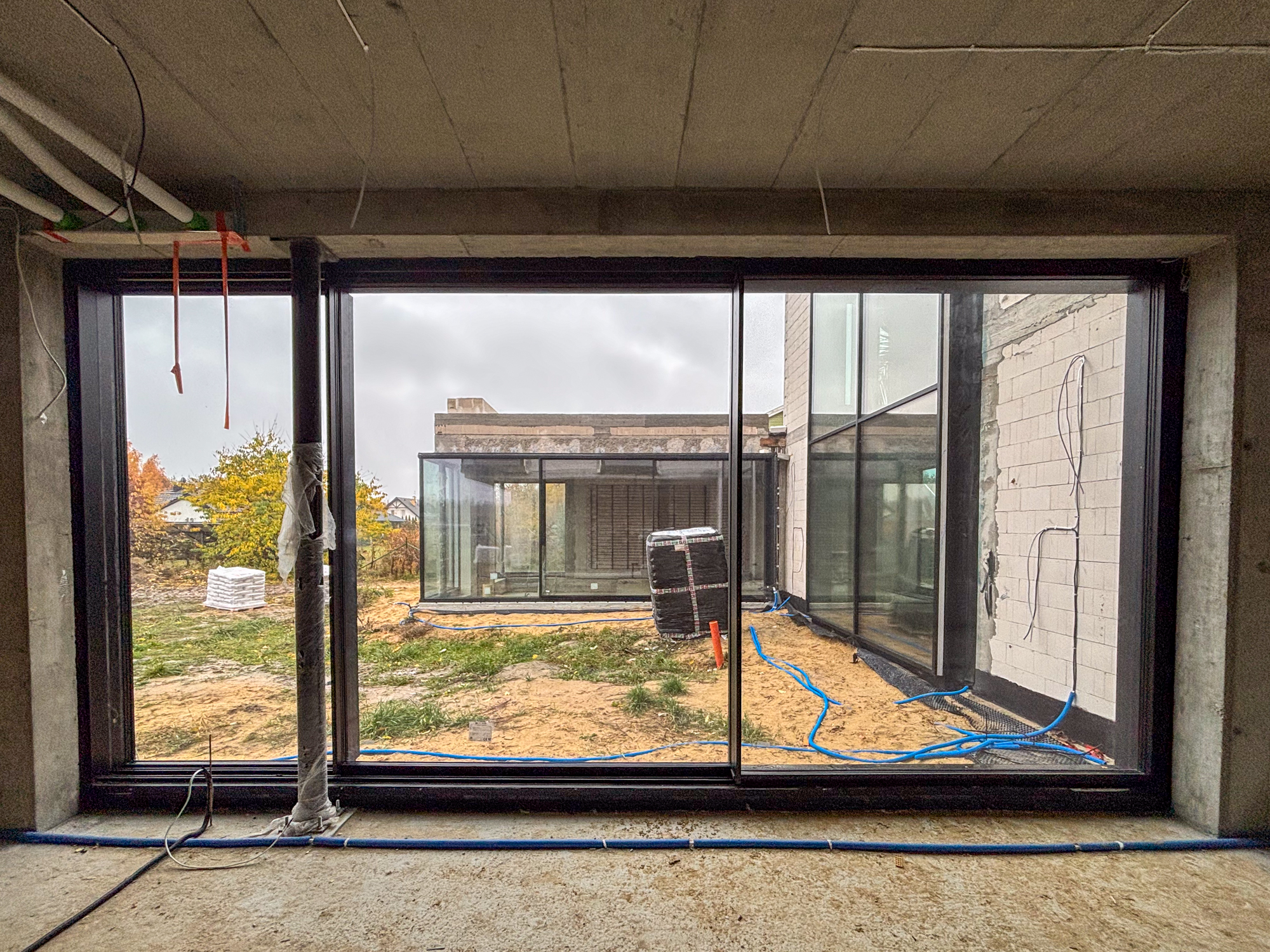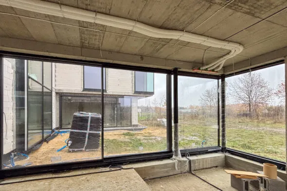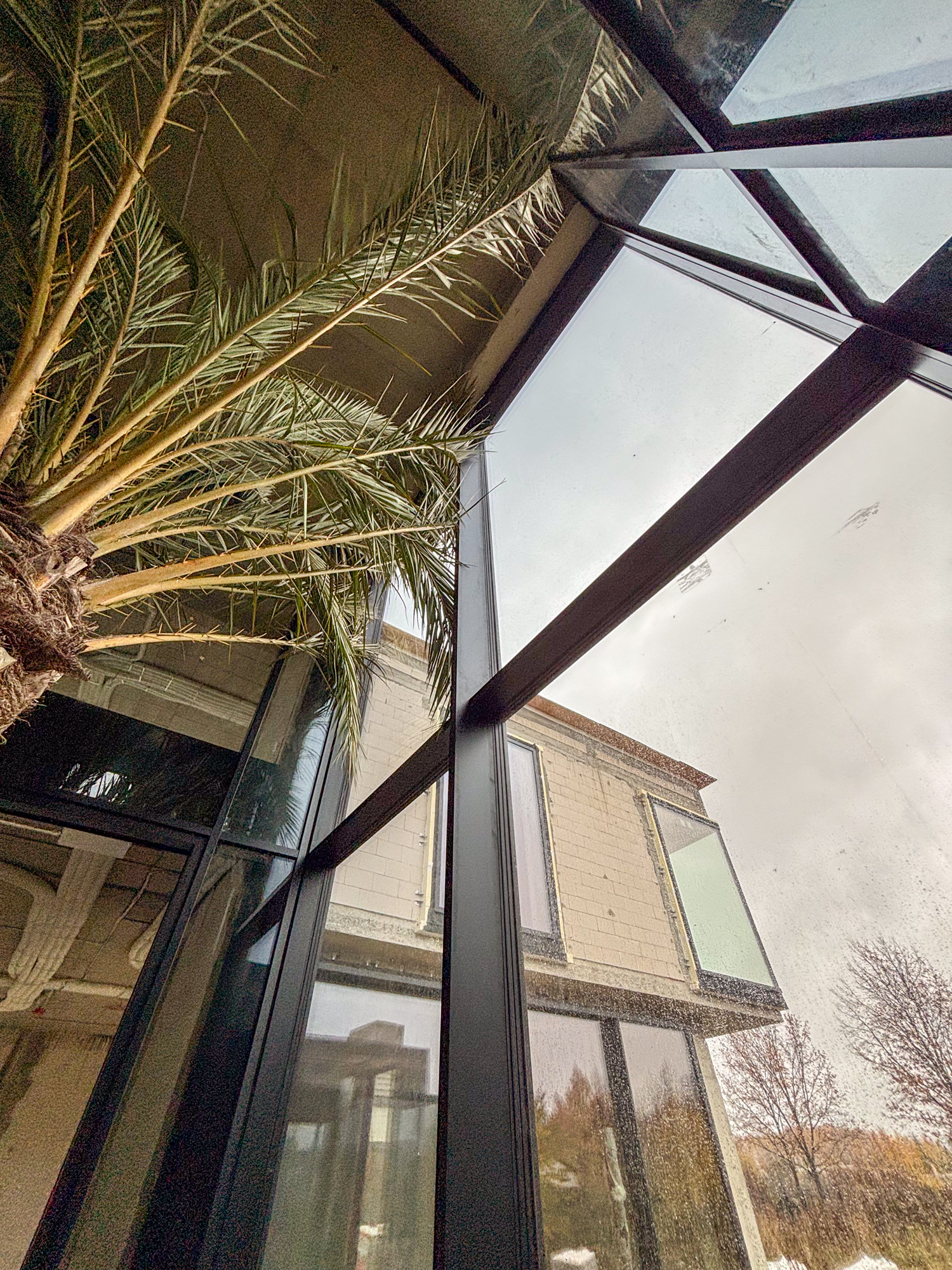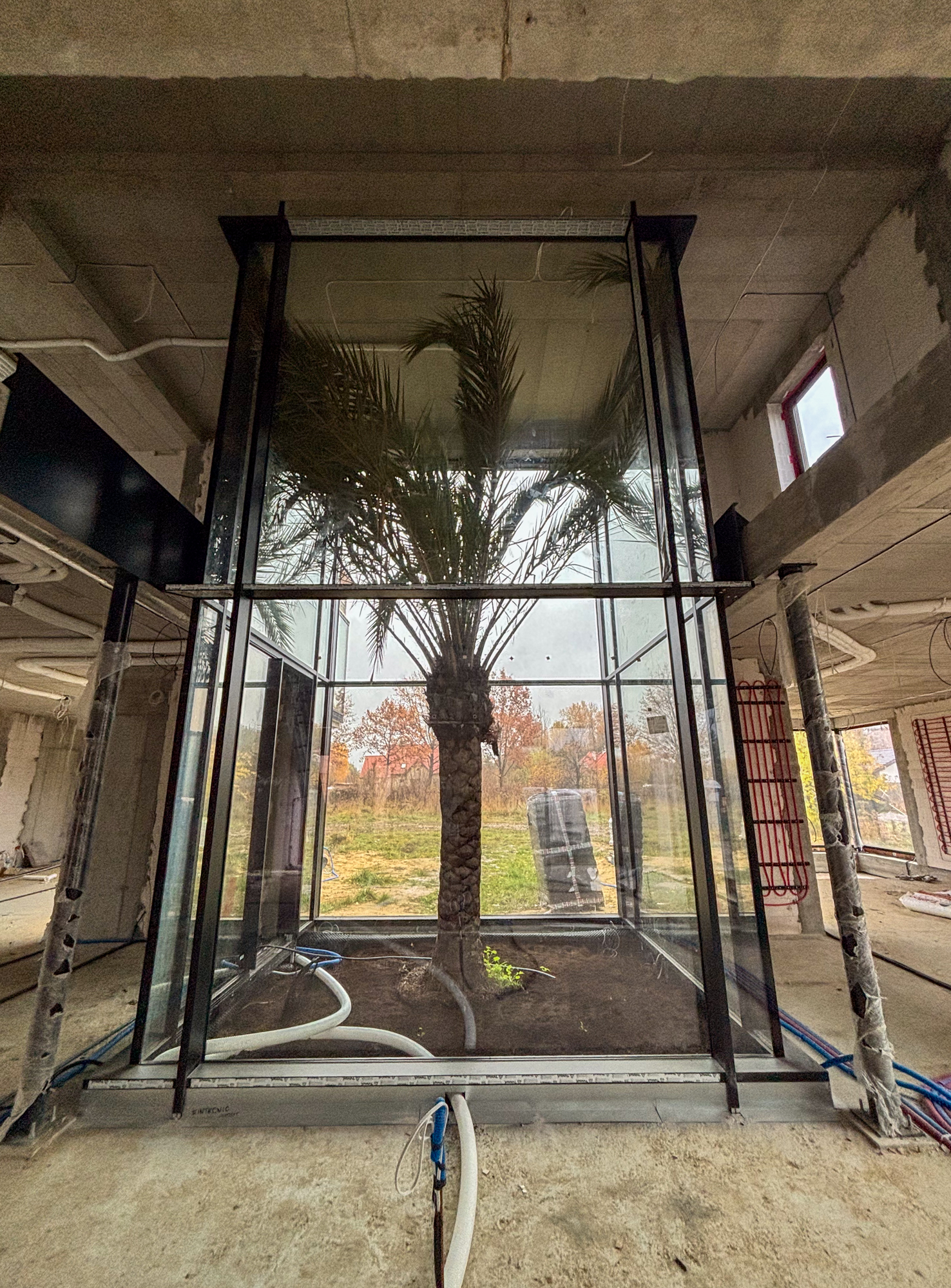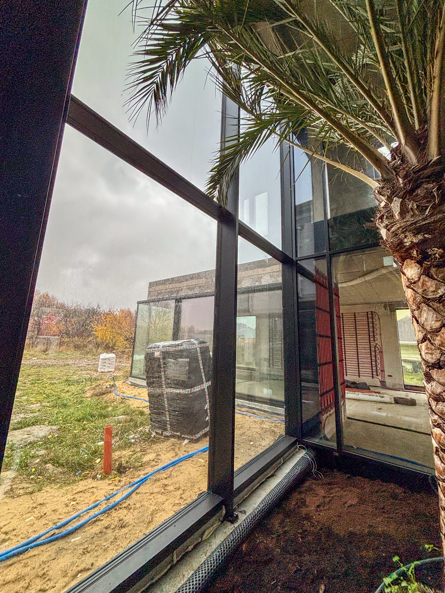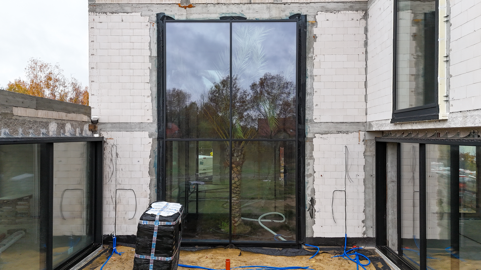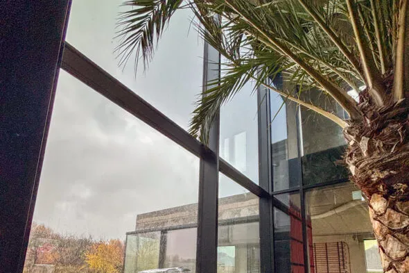 Wyjątkowa fasada aluminiowa o wysokości 7 metrów oraz efektowne przeszklenia Glass Corner tworzą w tej realizacji otwartą, jasną strefę dzienną z nietuzinkową, egzotyczną rośliną w centrum – kilkumetrowa palma otrzymuje tu idealne warunki wzrostu przez cały rok. Zastosowaliśmy system Yawal FA 50 N, okna i przeszklenia MoreView klasy S oraz konstrukcje TM 77 N, całość utrzymana w głębokim macie RAL 9011 struktura.