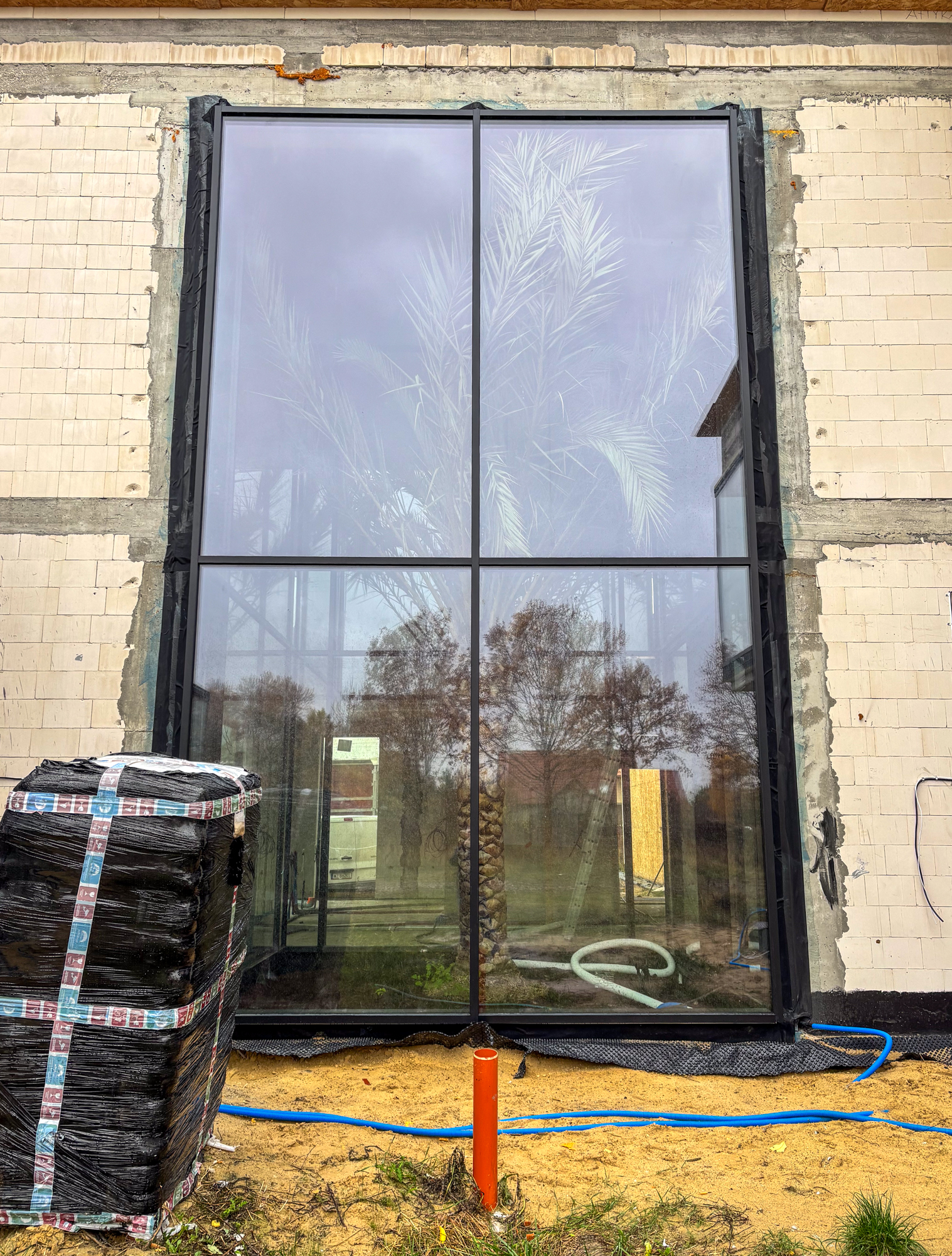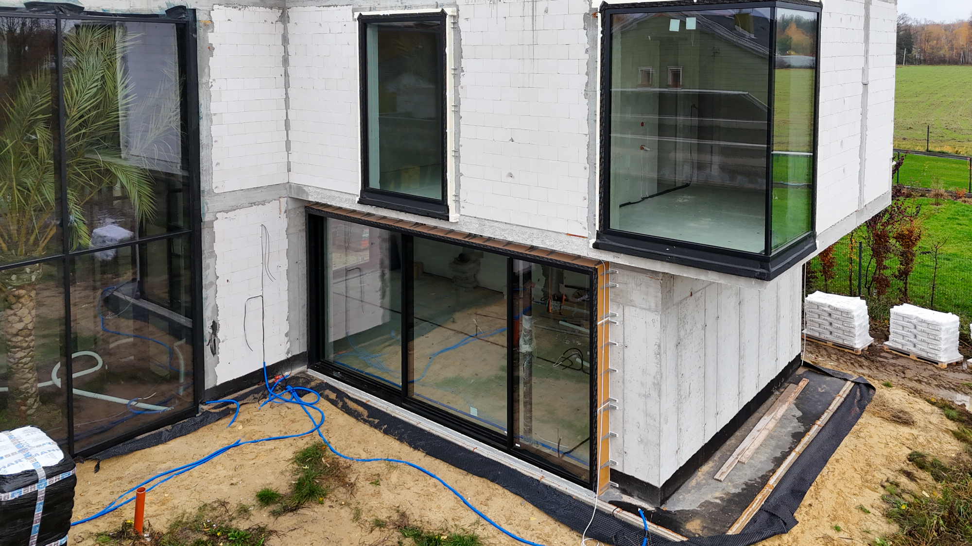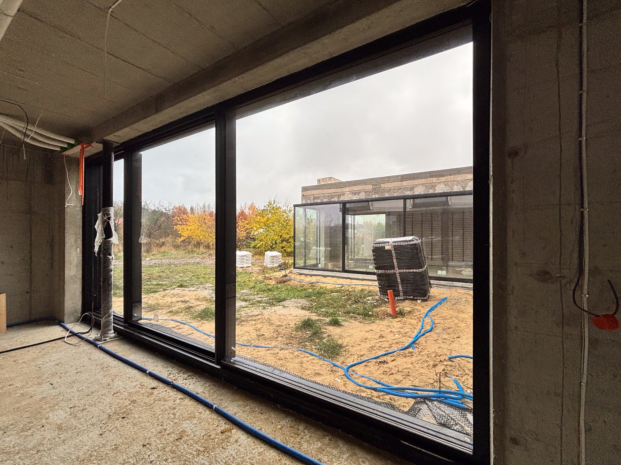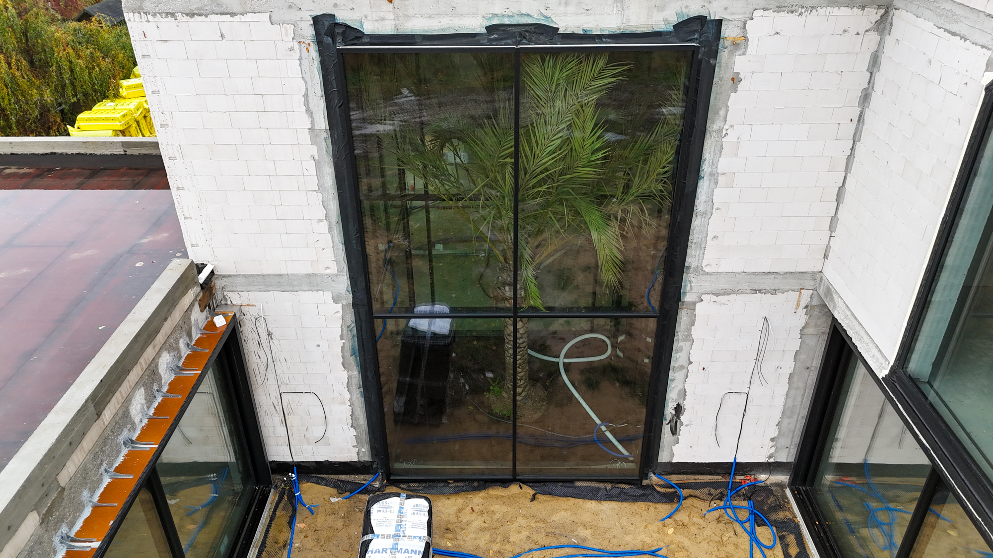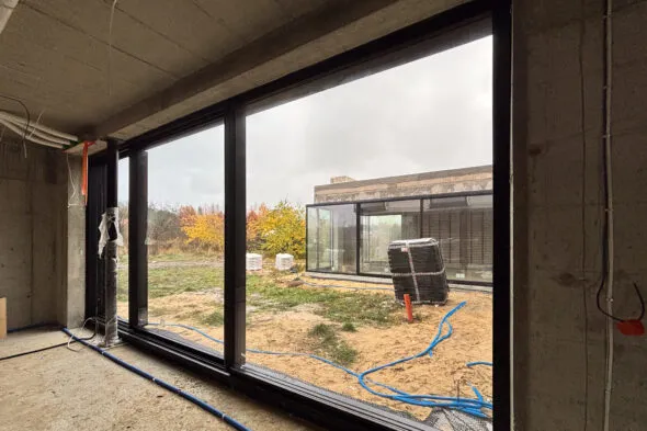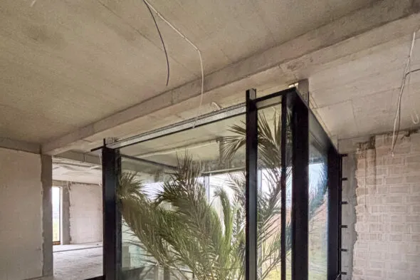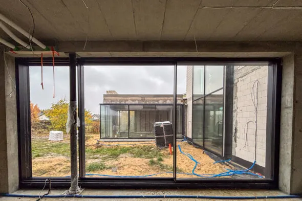 Wyjątkowa fasada aluminiowa o wysokości 7 metrów oraz efektowne przeszklenia Glass Corner tworzą w tej realizacji otwartą, jasną strefę dzienną z nietuzinkową, egzotyczną rośliną w centrum – kilkumetrowa palma otrzymuje tu idealne warunki wzrostu przez cały rok. Zastosowaliśmy system Yawal FA 50 N, okna i przeszklenia MoreView klasy S oraz konstrukcje TM 77 N, całość utrzymana w głębokim macie RAL 9011 struktura.