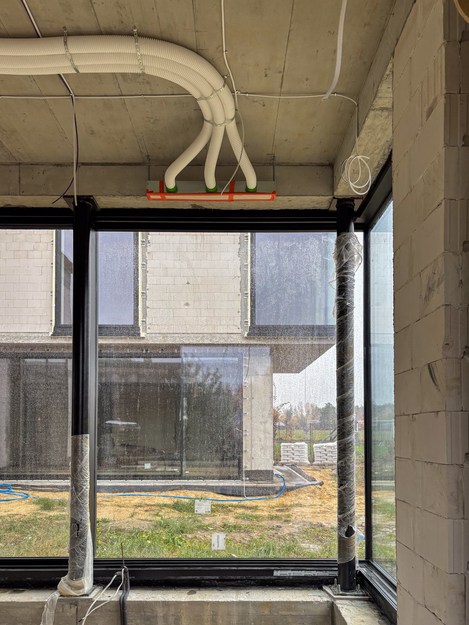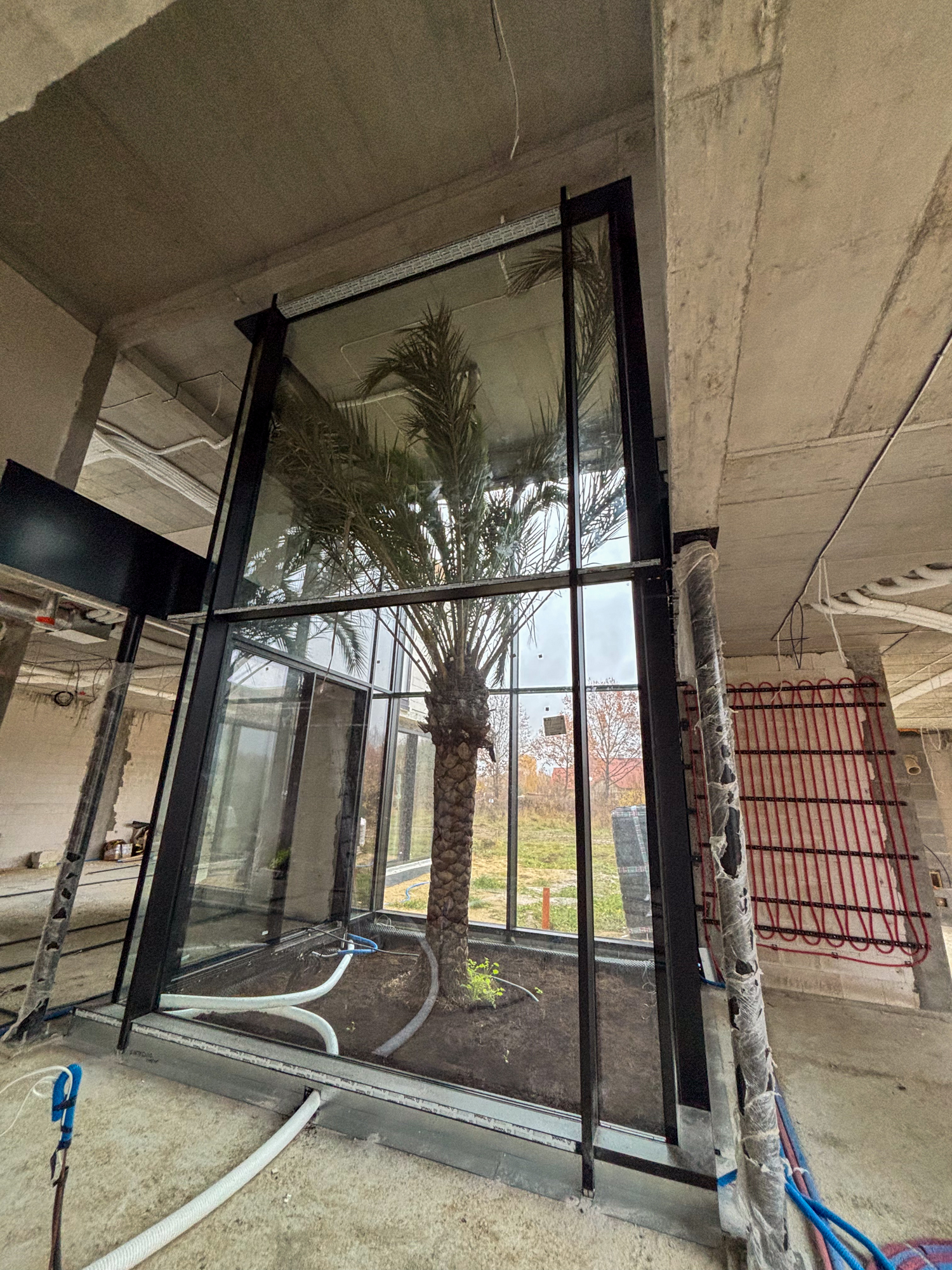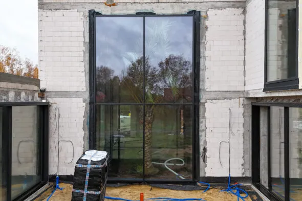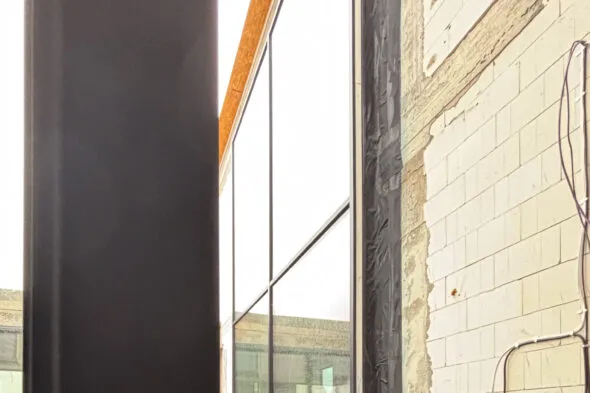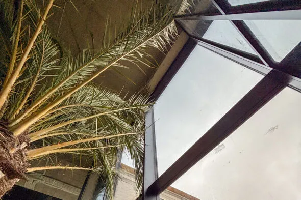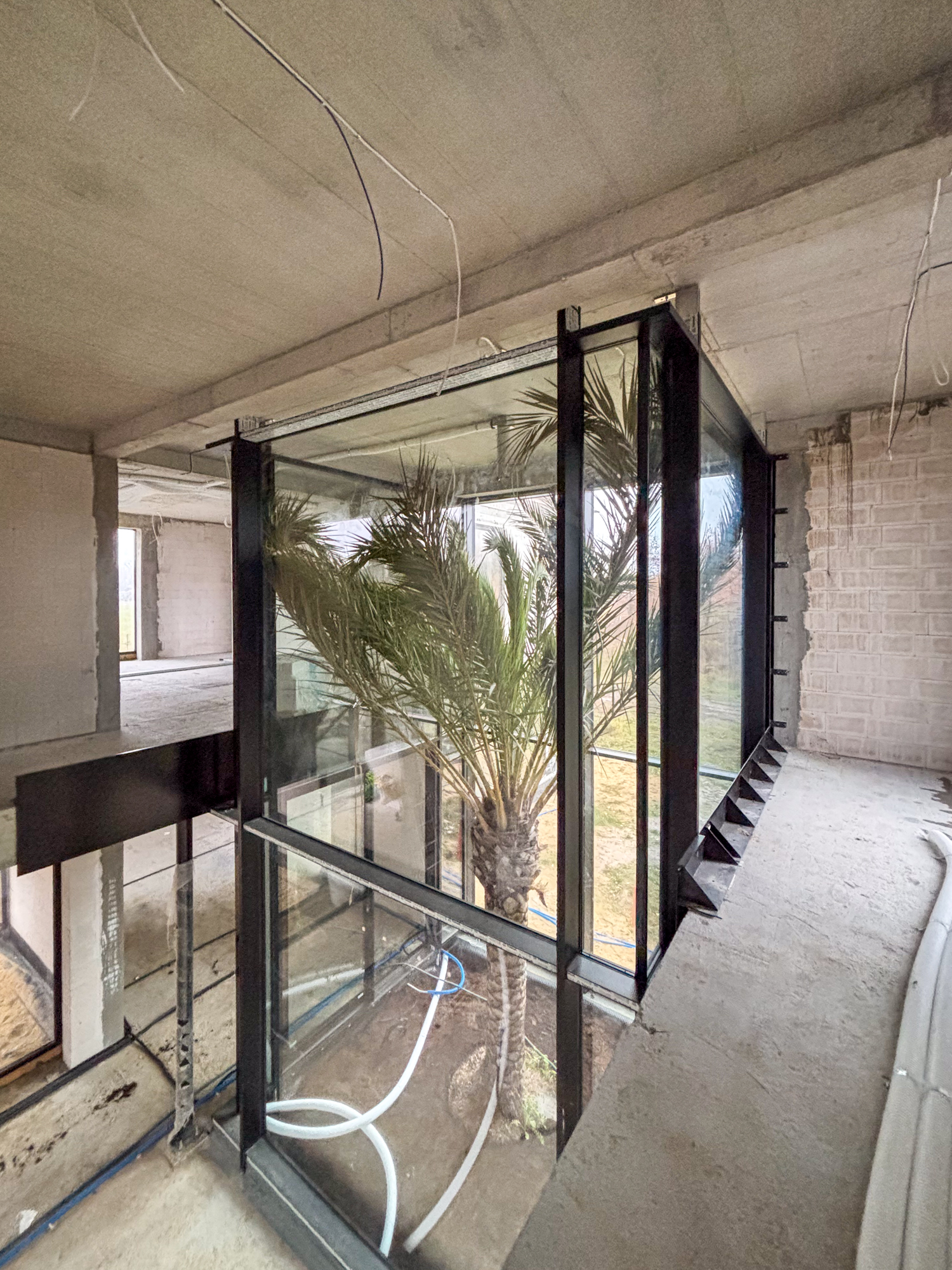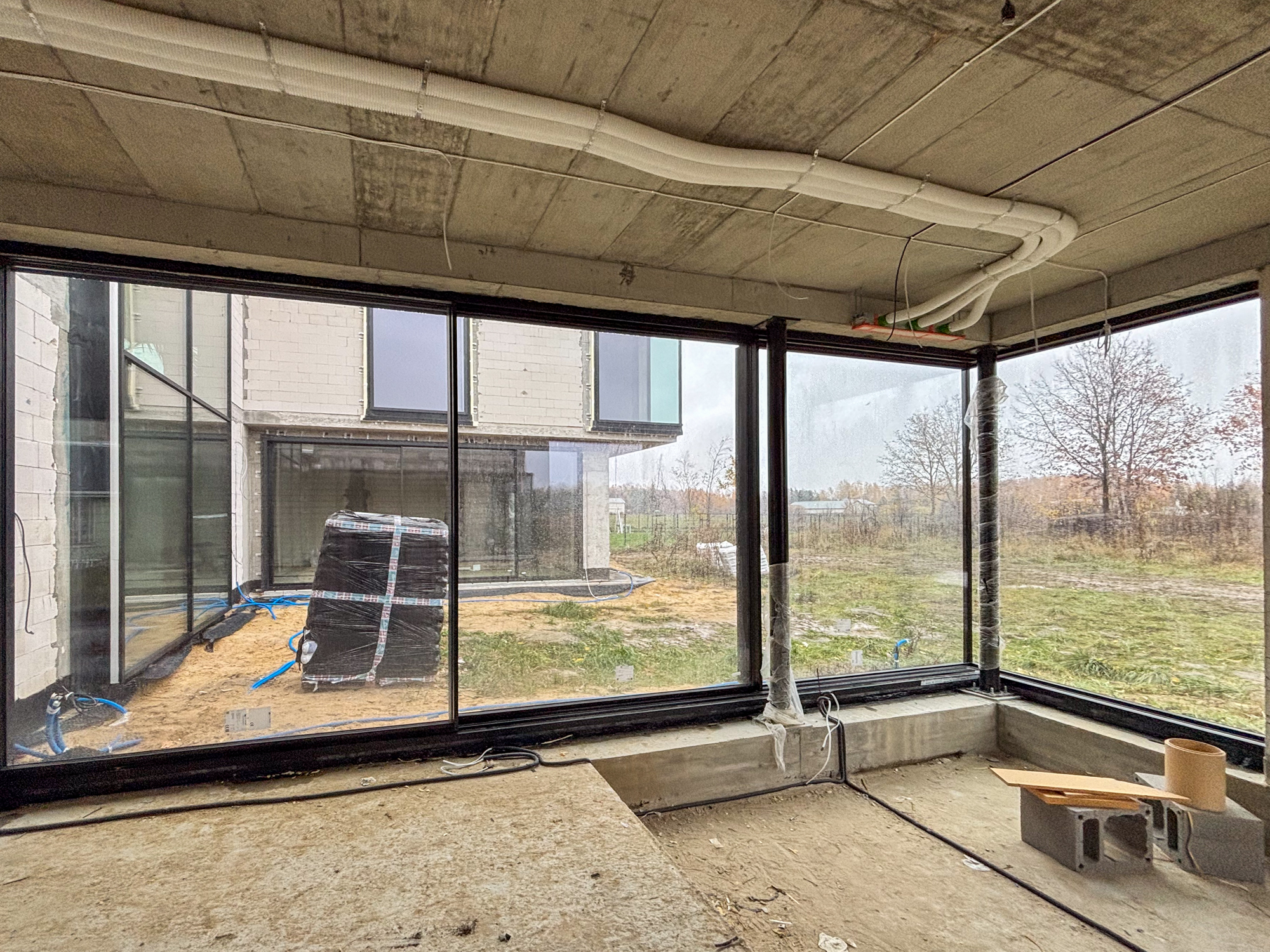 Wyjątkowa fasada aluminiowa o wysokości 7 metrów oraz efektowne przeszklenia Glass Corner tworzą w tej realizacji otwartą, jasną strefę dzienną z nietuzinkową, egzotyczną rośliną w centrum – kilkumetrowa palma otrzymuje tu idealne warunki wzrostu przez cały rok. Zastosowaliśmy system Yawal FA 50 N, okna i przeszklenia MoreView klasy S oraz konstrukcje TM 77 N, całość utrzymana w głębokim macie RAL 9011 struktura.