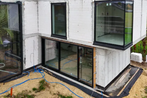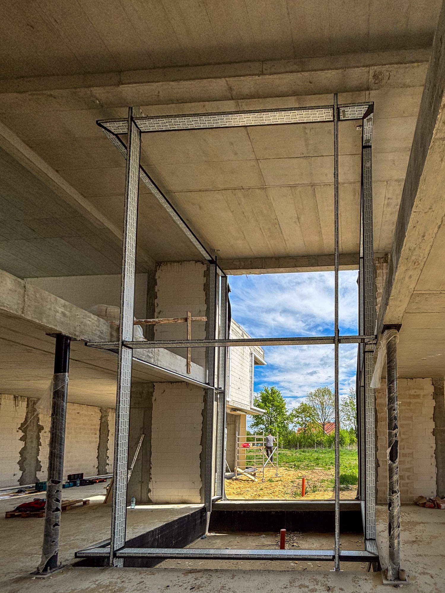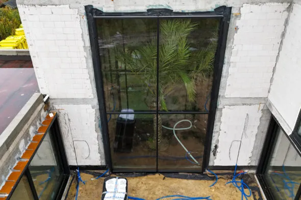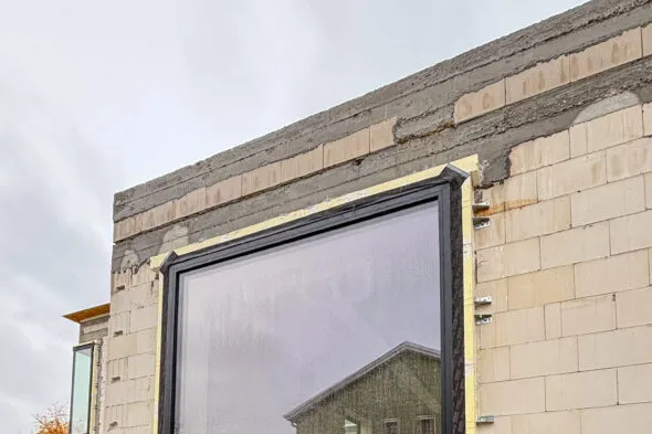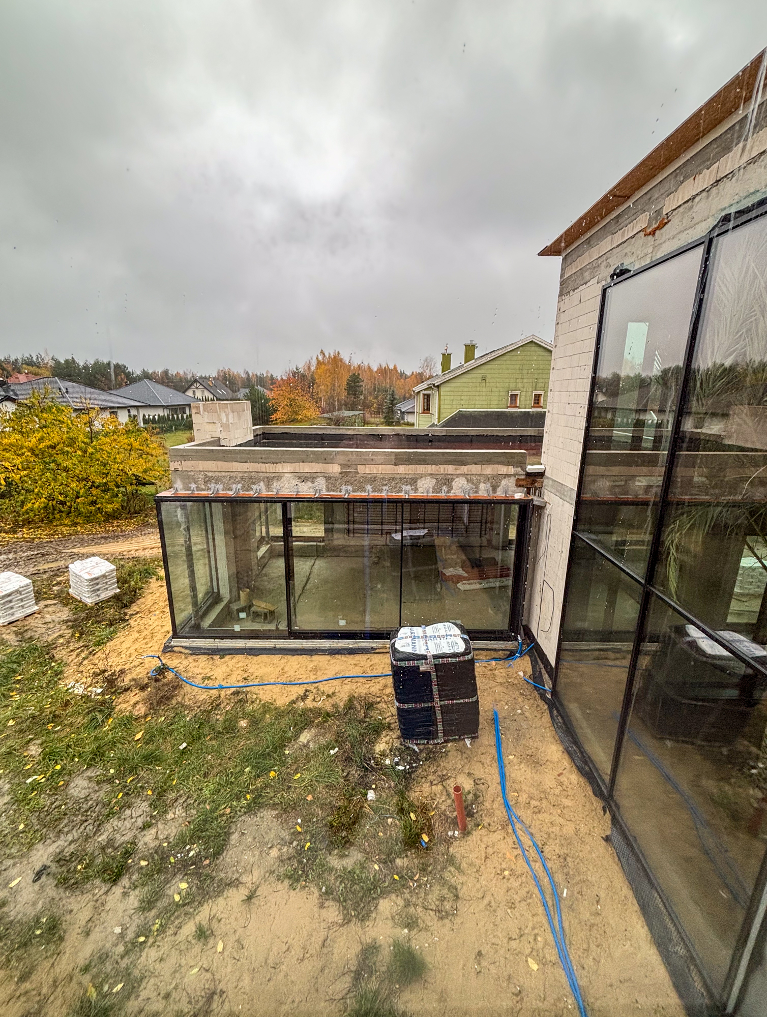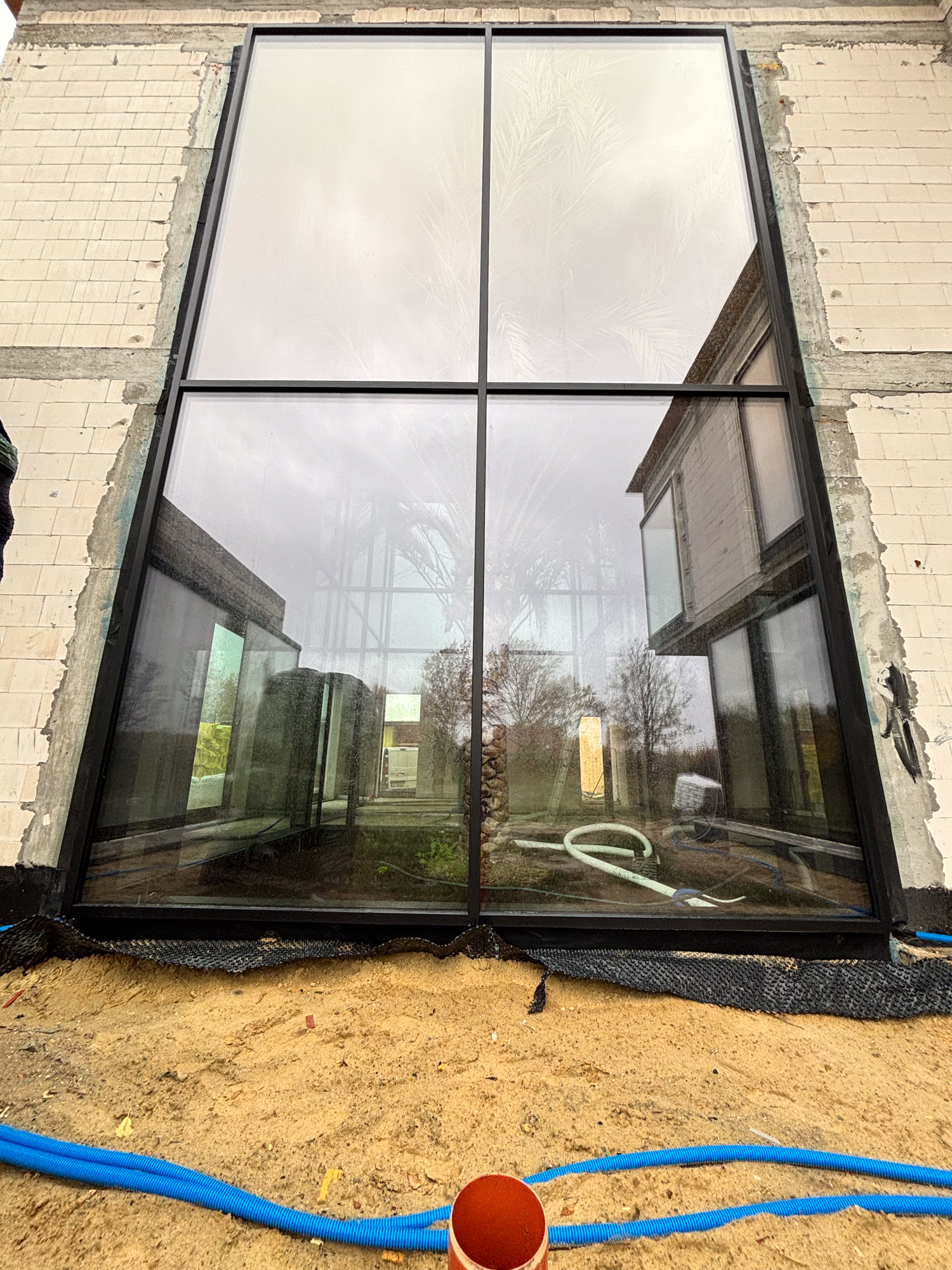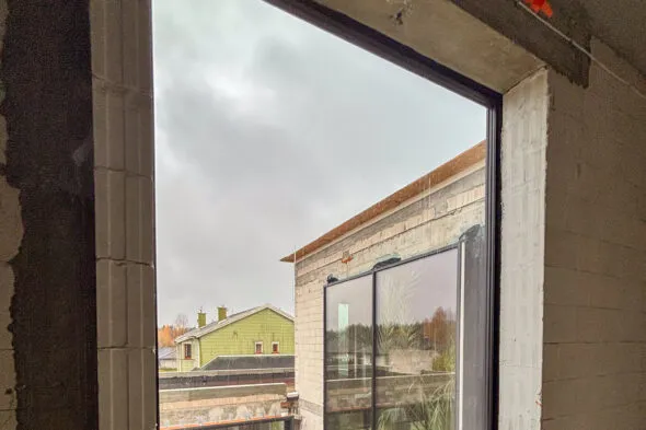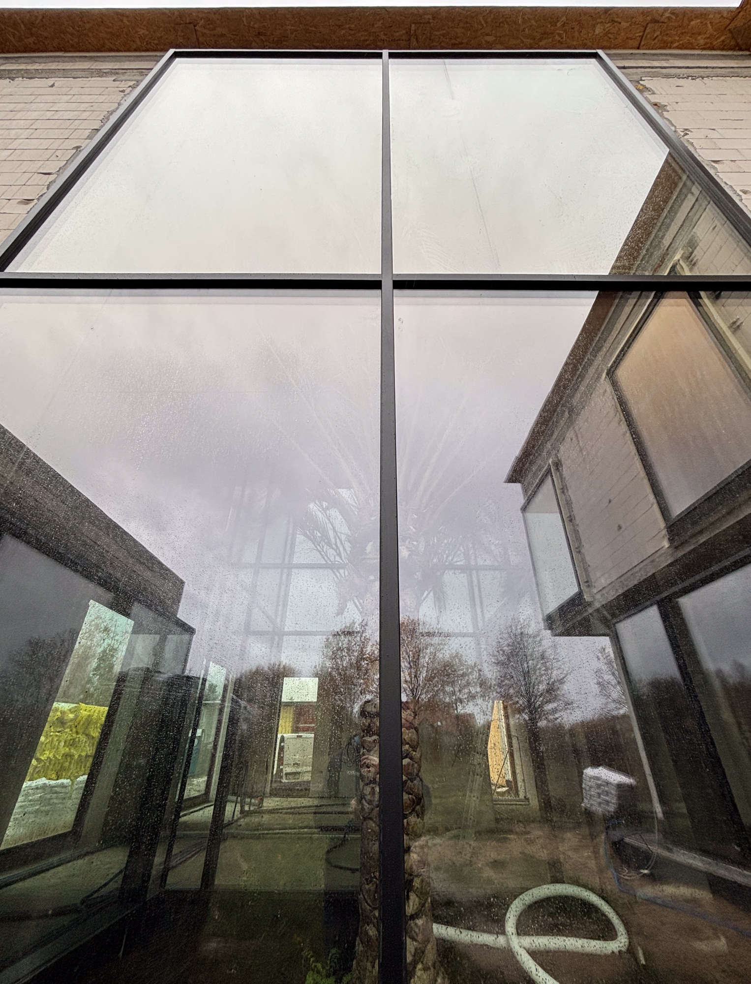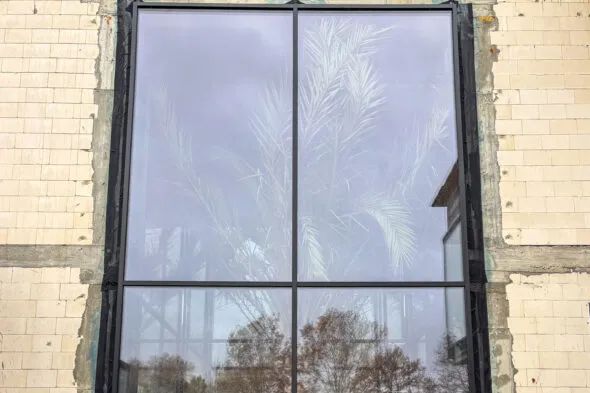 Wyjątkowa fasada aluminiowa o wysokości 7 metrów oraz efektowne przeszklenia Glass Corner tworzą w tej realizacji otwartą, jasną strefę dzienną z nietuzinkową, egzotyczną rośliną w centrum – kilkumetrowa palma otrzymuje tu idealne warunki wzrostu przez cały rok. Zastosowaliśmy system Yawal FA 50 N, okna i przeszklenia MoreView klasy S oraz konstrukcje TM 77 N, całość utrzymana w głębokim macie RAL 9011 struktura.