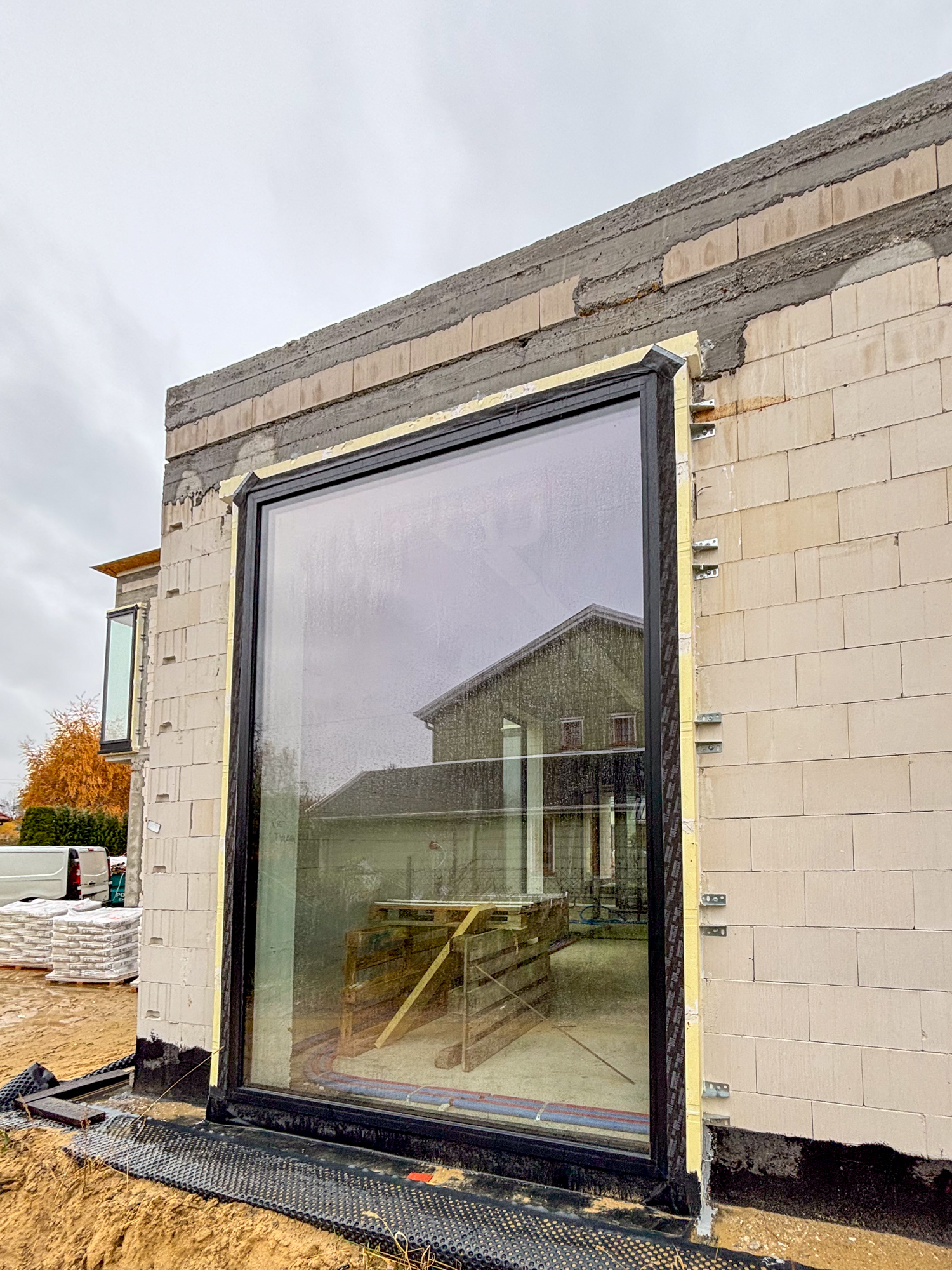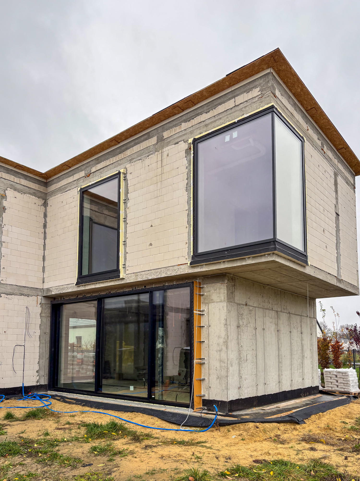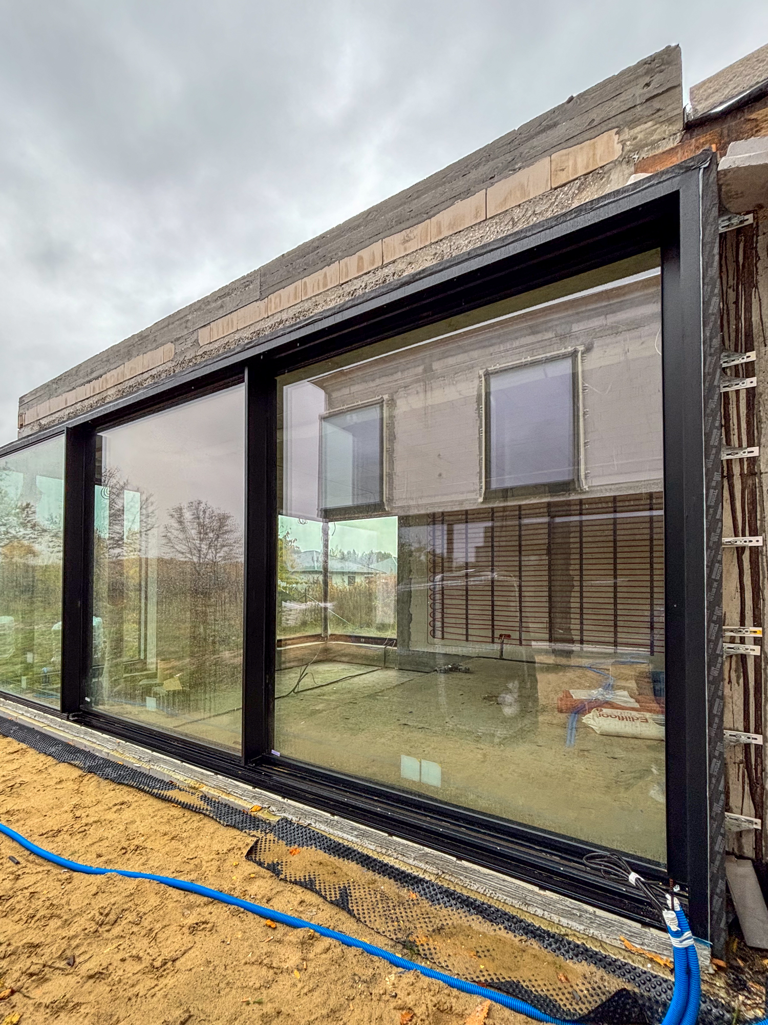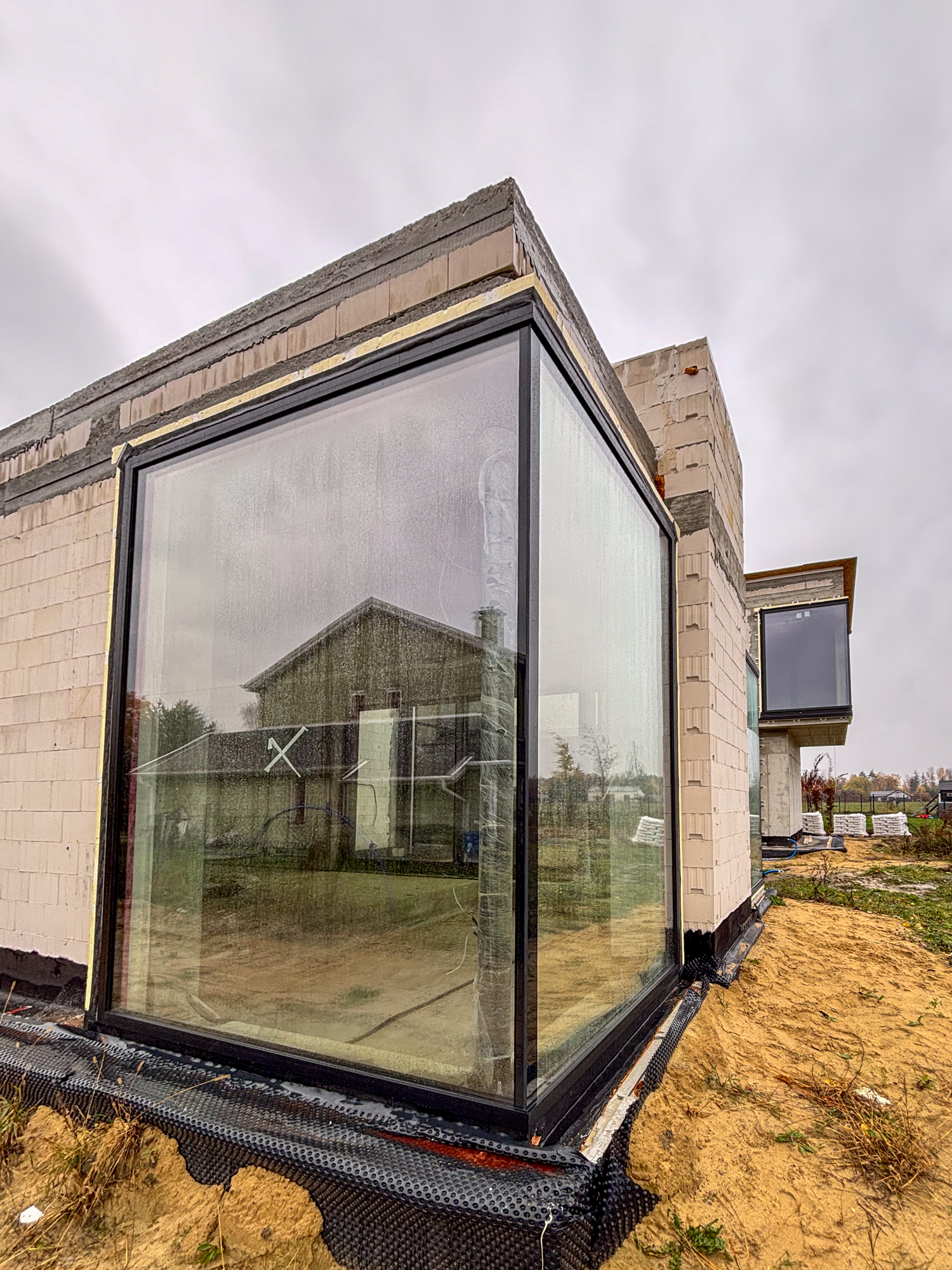 Szyby hartowane zapewniają wytrzymałość i bezpieczeństwo, a pętle alarmowe chronią dom. Montaż na systemie ciepła belka Marbet i podwalinach oraz instalacja w warstwie ocieplenia gwarantują wysoką izolacyjność termiczną. Efekt panoramiczny podkreślają okna typu Glass Corner, które wpuszczają naturalne światło i rozmywają granice pomiędzy wnętrzem a ogrodem.