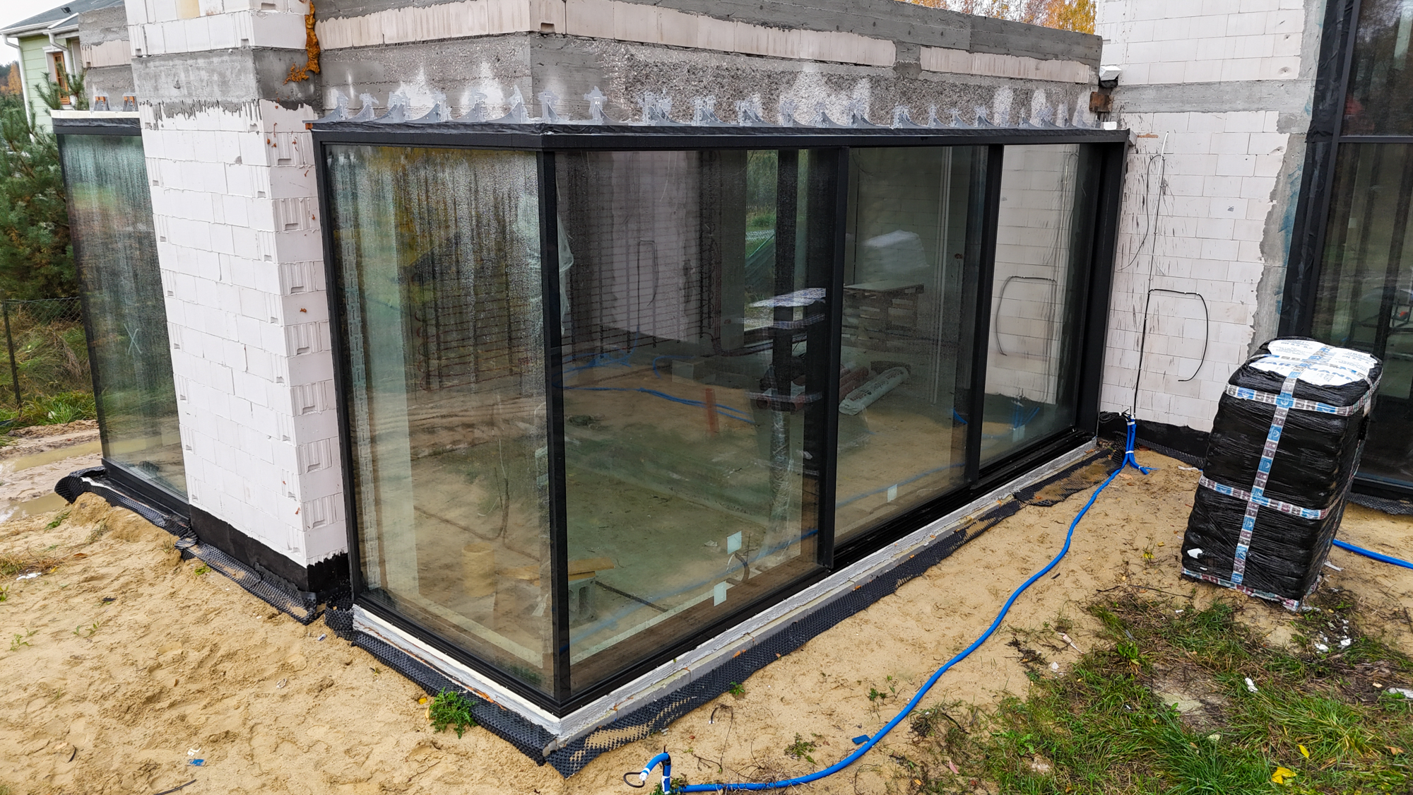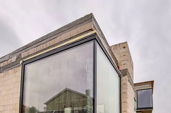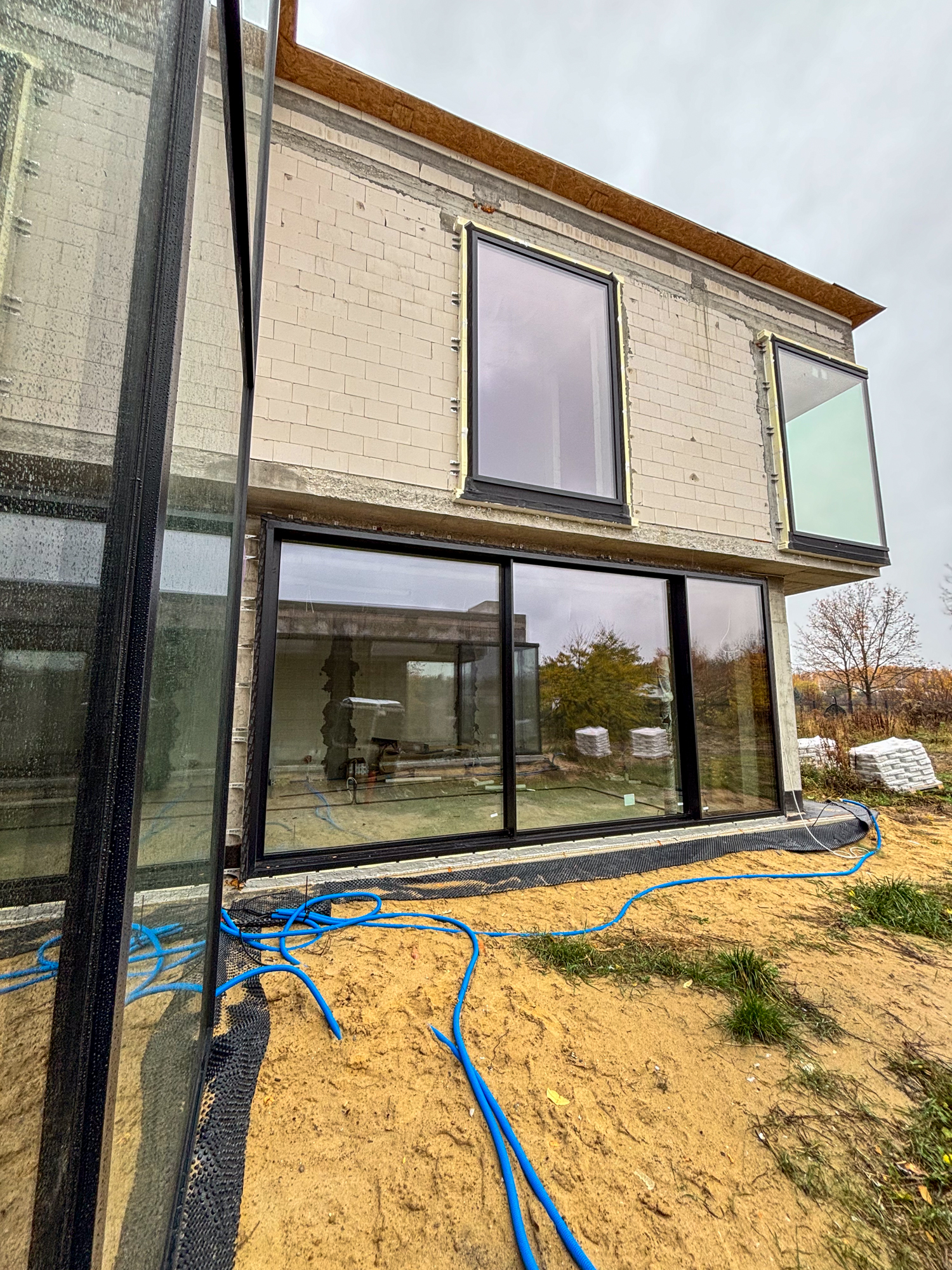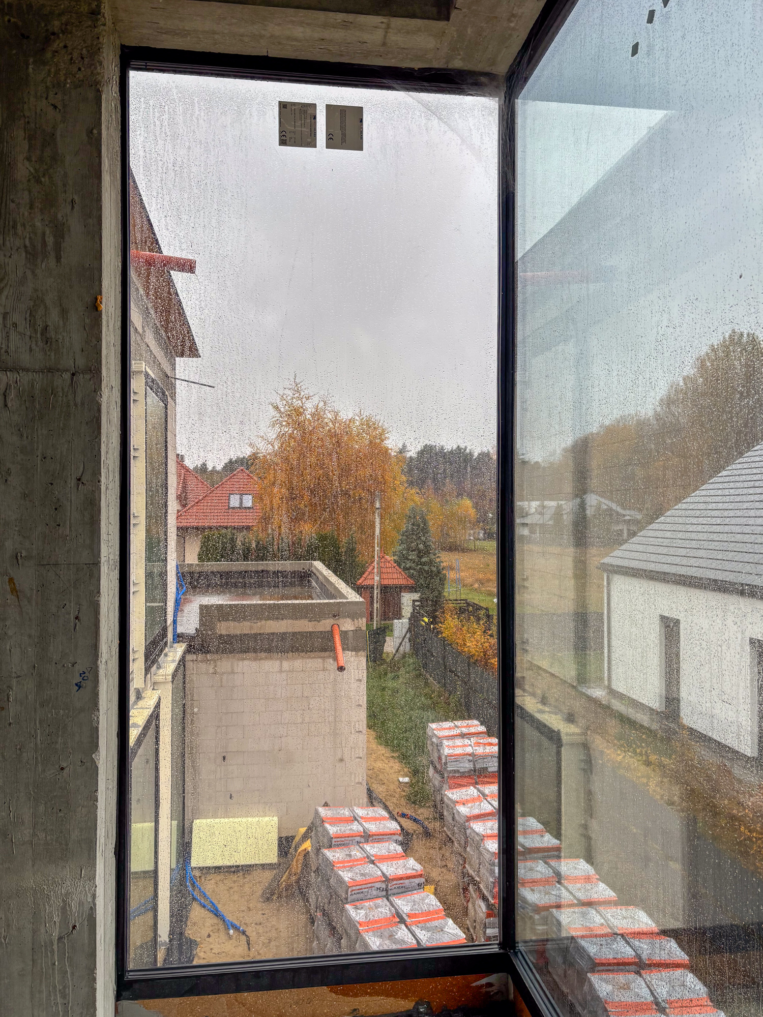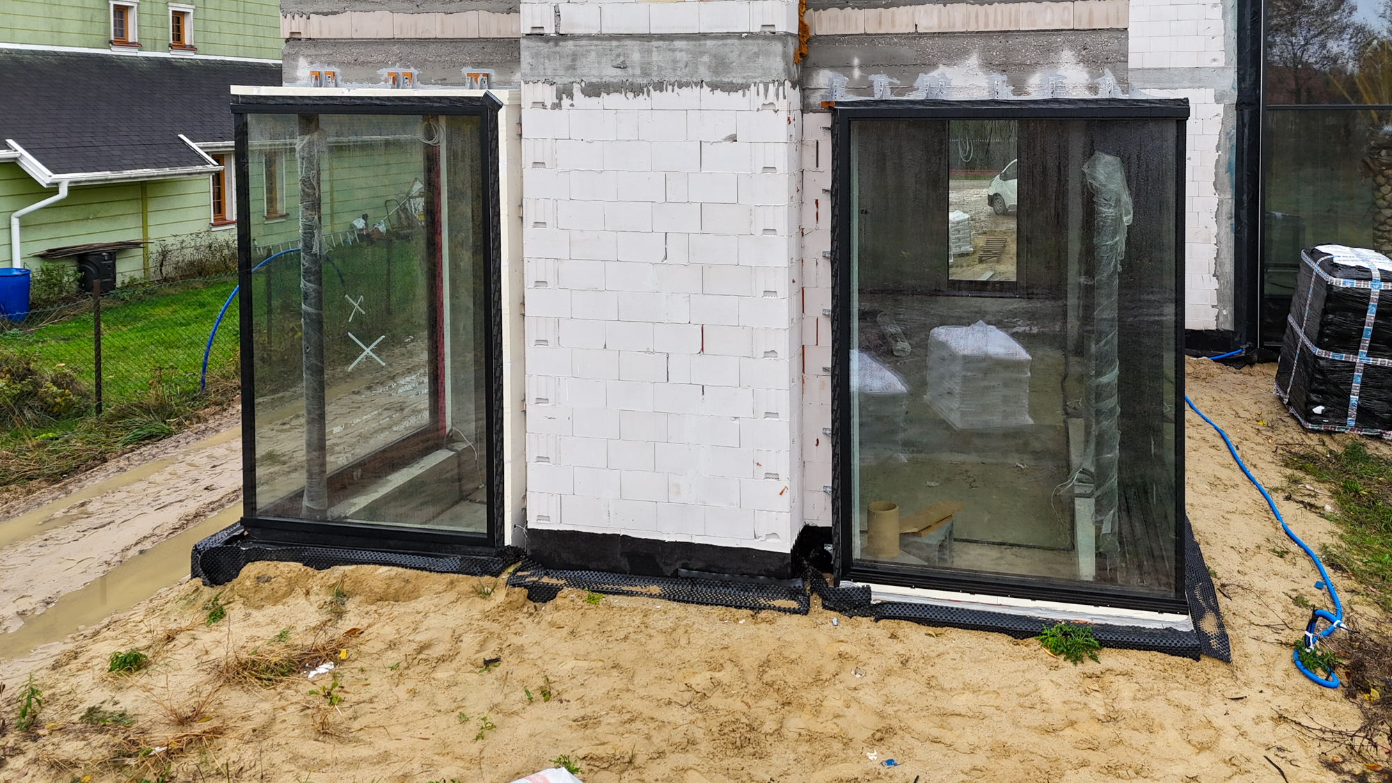 Szyby hartowane zapewniają wytrzymałość i bezpieczeństwo, a pętle alarmowe chronią dom. Montaż na systemie ciepła belka Marbet i podwalinach oraz instalacja w warstwie ocieplenia gwarantują wysoką izolacyjność termiczną. Efekt panoramiczny podkreślają okna typu Glass Corner, które wpuszczają naturalne światło i rozmywają granice pomiędzy wnętrzem a ogrodem.
