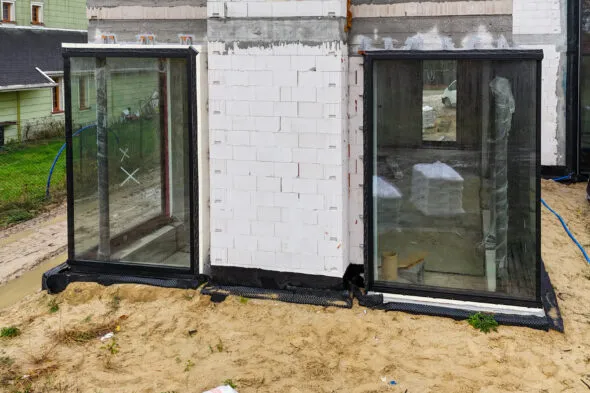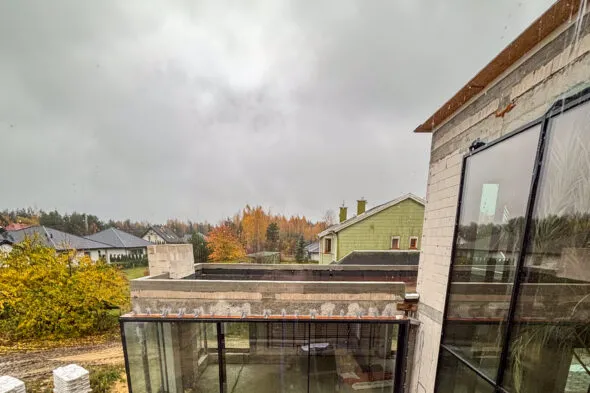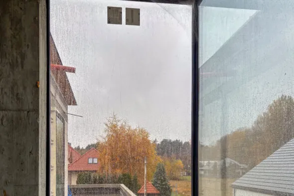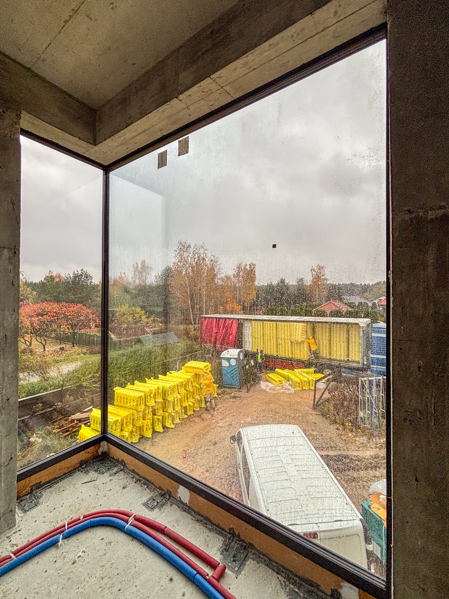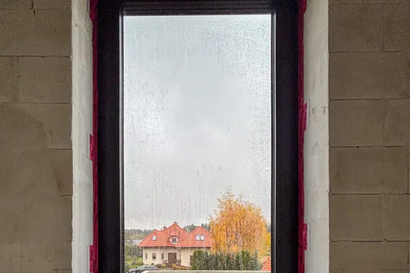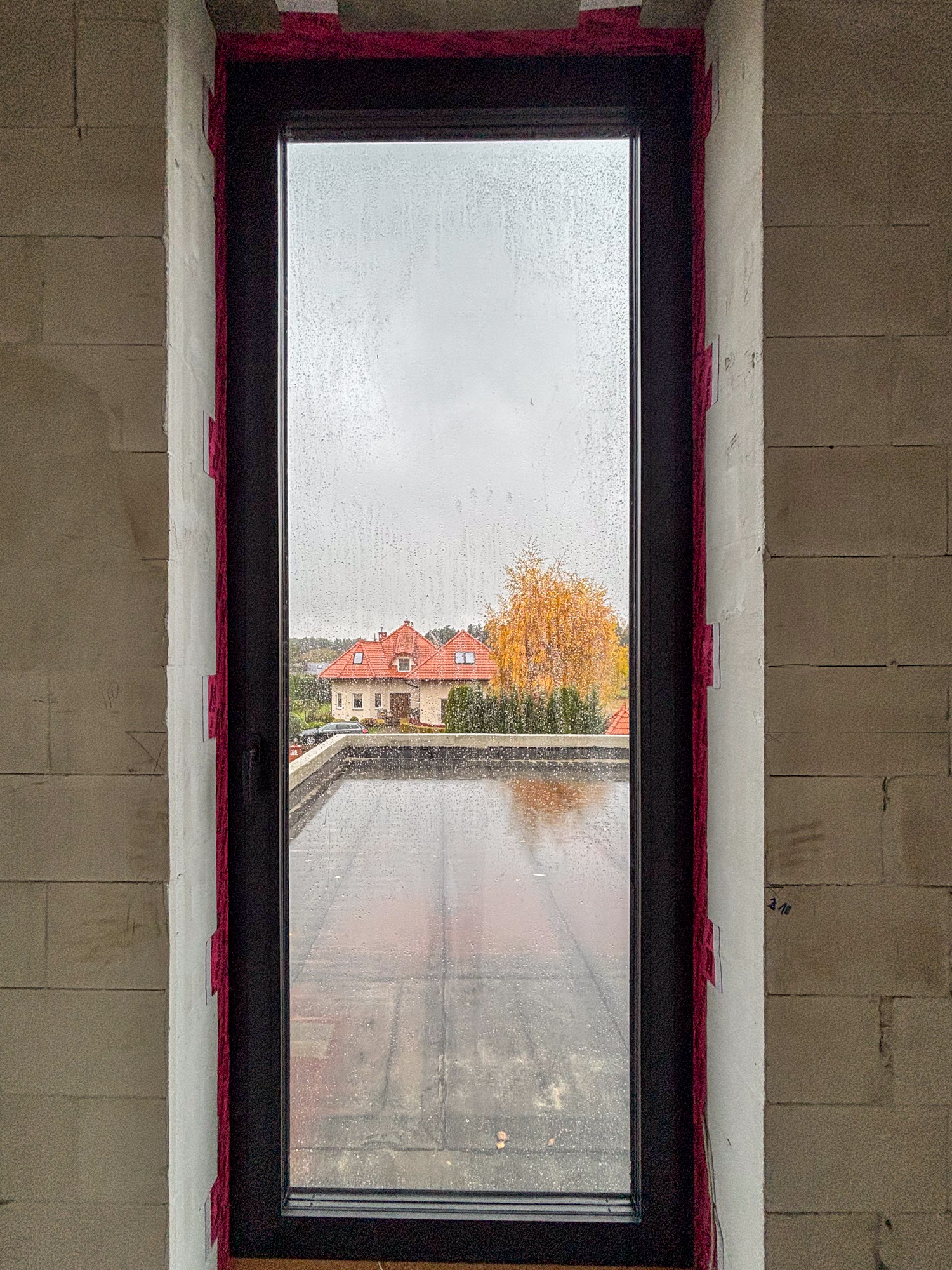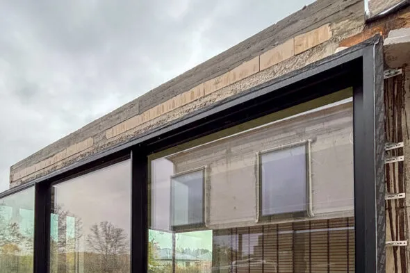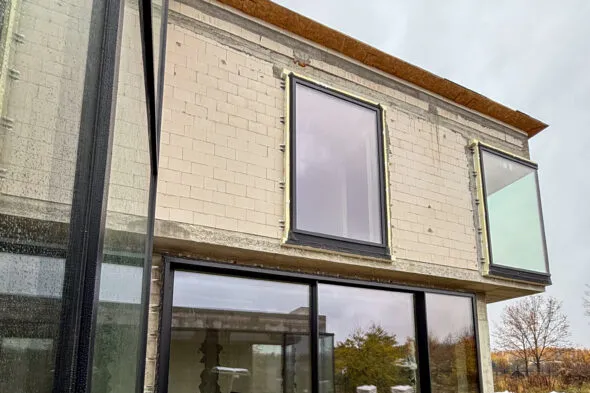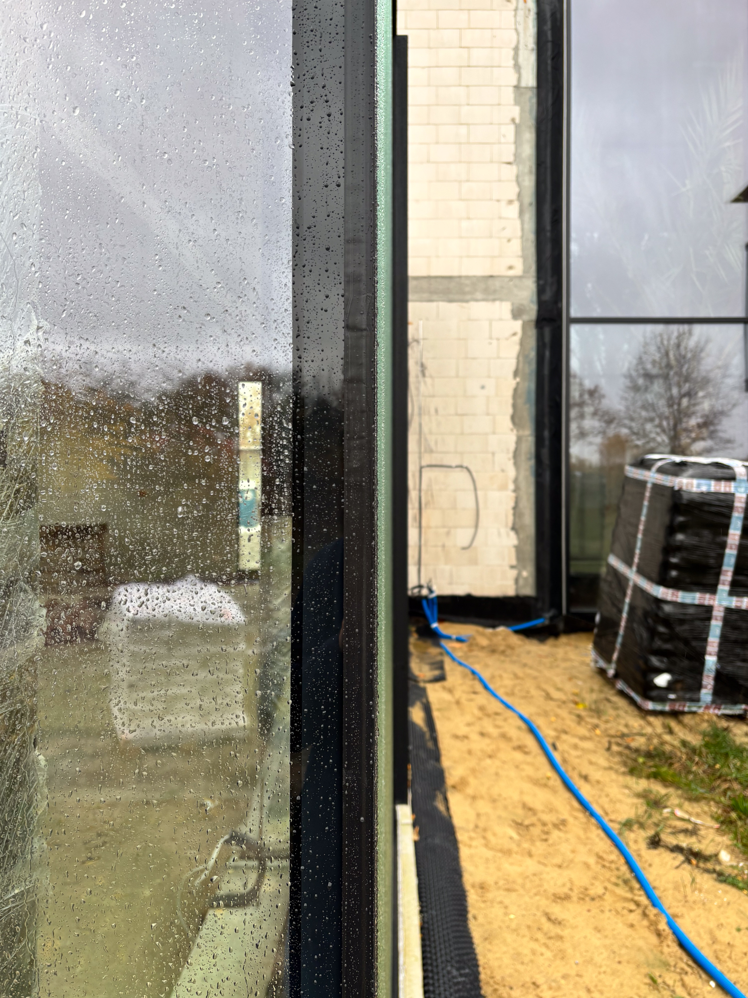 Szyby hartowane zapewniają wytrzymałość i bezpieczeństwo, a pętle alarmowe chronią dom. Montaż na systemie ciepła belka Marbet i podwalinach oraz instalacja w warstwie ocieplenia gwarantują wysoką izolacyjność termiczną. Efekt panoramiczny podkreślają okna typu Glass Corner, które wpuszczają naturalne światło i rozmywają granice pomiędzy wnętrzem a ogrodem.